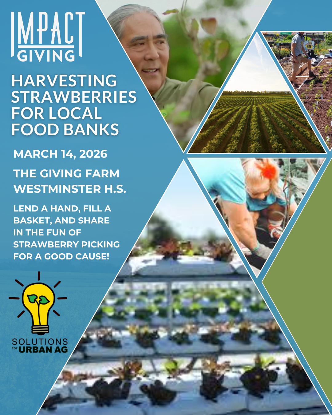 Celebrate spring and community with us, Harvesting Strawberries for local foodbancks on Saturday, March 14, 2026, at The Giving Farm, Westminster High School. Together with Solutions for Urban Ag, we’ll roll up our sleeves, fill baskets, and take part in the fun of strawberry picking while supporting a healthier, more sustainable food system.